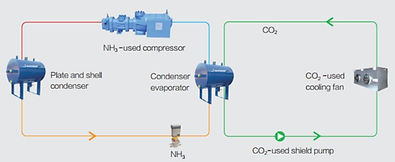 CO2 makes the system fully clean, free of refrigerant oil residue, heat transfer is much more efficient than the traditional systems of NH3 or freon, cooling is rapid and there is no issue of cleaning the refrigeration oil residue at the refrigeration end.